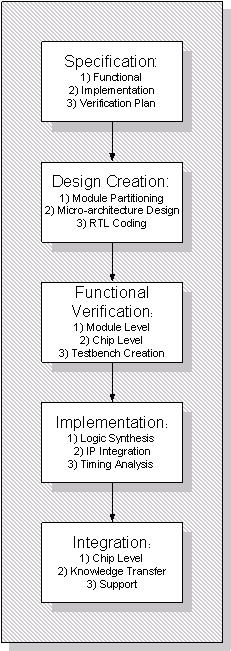 Figure 1: Typical FPGA Design Flow PKL Design can assist in any or all aspects of the FPGA design flow. PKL Design has expertise with various FPGA device families from the leading FPGA device vendors, coupled with vast experience in the use of industry standard FPGA synthesis tools, including Leonardo Spectrum, Synplicity Synplify and Synopsys FPGA Compiler II. This means PKL Design has the knowledge to help you achieve the most efficient implementation of your design, whether your overriding constraint is performance, area, power or a mixture of all three. Due to the increased complexity associated with large gate array designs, it is not uncommon for a team of designers to be working on a single design. The availability of multi million FPGA devices is helping achieve the goal of System on a Chip (SoC), which is the incorporation of an entire system onto one chip. An essential part of SoC design is the requirement to leverage existing intellectual property (IP) to improve designer productivity. Reusable IP is essential to constructing SoCs in a reasonable amount of time. PKL Design can assist by undertaling your IP development.IP Development Our IP development service allows you to accelerate the frontend design of your gate array solution by focusing on the creation of IP modules. The resulting database provided by PKL will be structured and verified, allowing fast trouble free integration and verification with the design’s other modules. Support for module integration and system verification is provided with testbench components to facilitate a fast successful design cycle. Figure 2 illustrates a typical IP development flow.